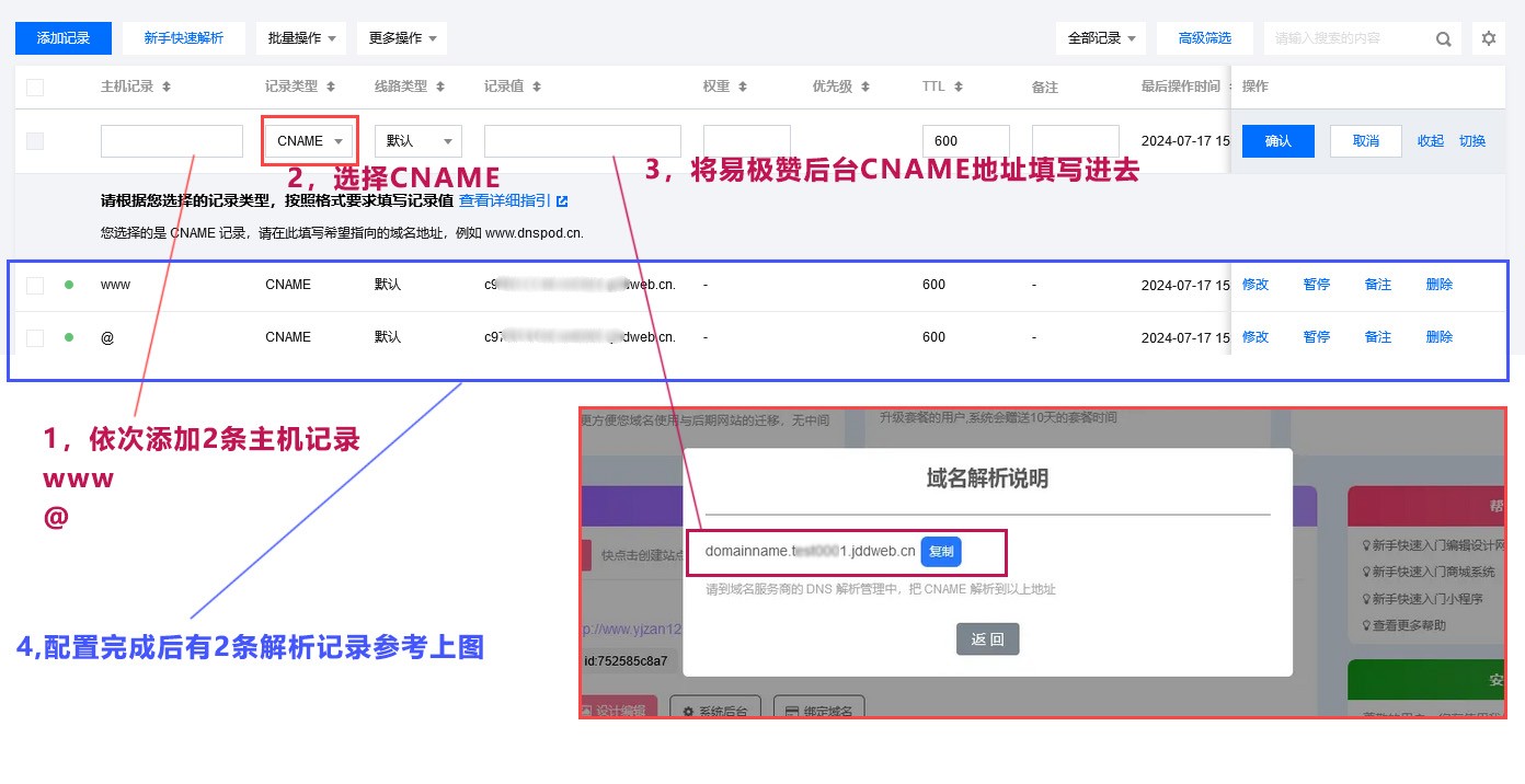 5,当您的域名已完成备案, 或您使用免备案的境外服务器(需向客服申请人工迁移,仅针对付费套餐用户),点击“CNAME”按钮后,可以查看到域名 解析的CNAME地址 ,点击复制按钮,去到您的域名服务商处将您的域名设置为cname到对应的地址。