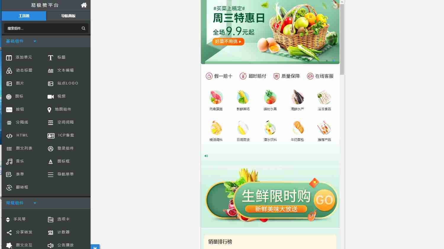 step3,在线编辑修改站点内容,设计完成后,点击发布这样一个超市购物小程序就制作完成了