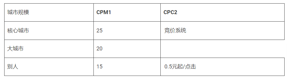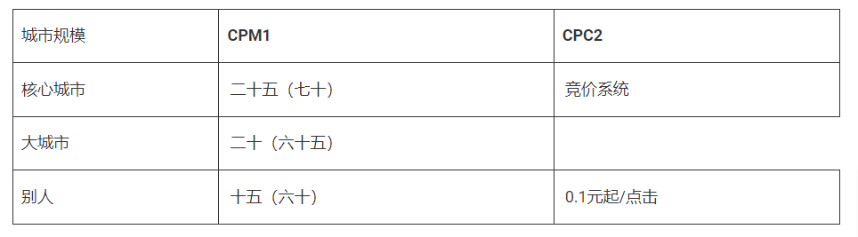 CPM(每千次展示的成本)。 核心城市:北京、上海
