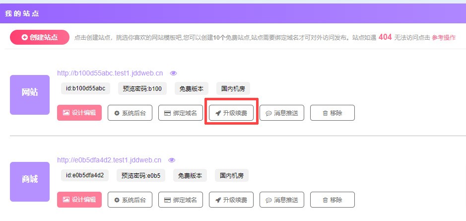 选择要升级的站点,点击“升级续费”按钮。