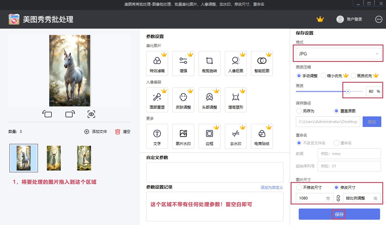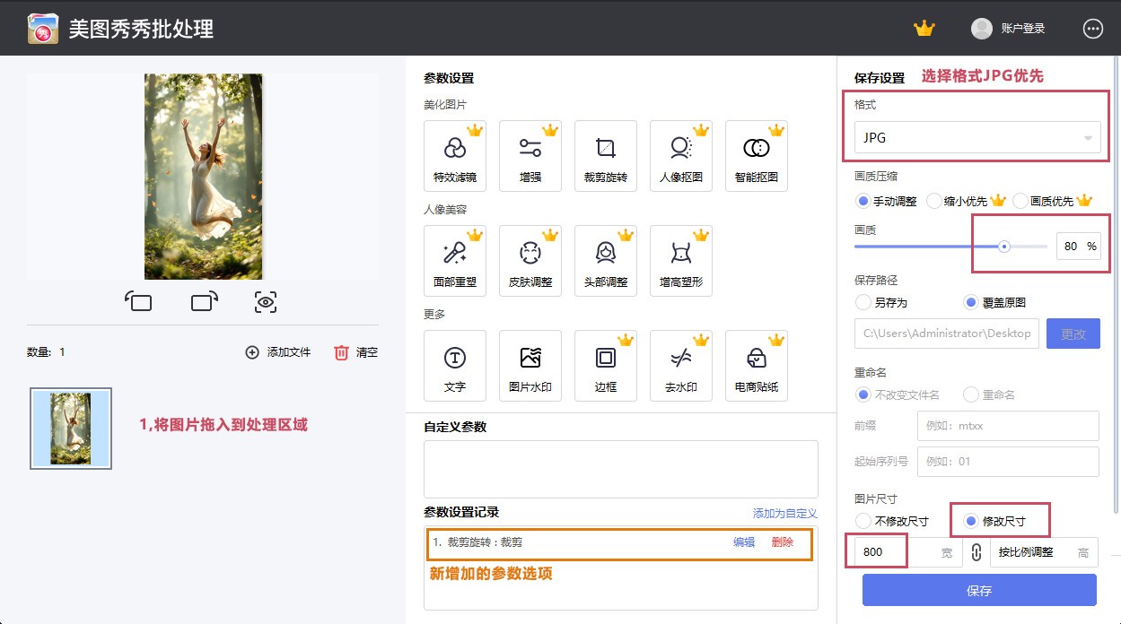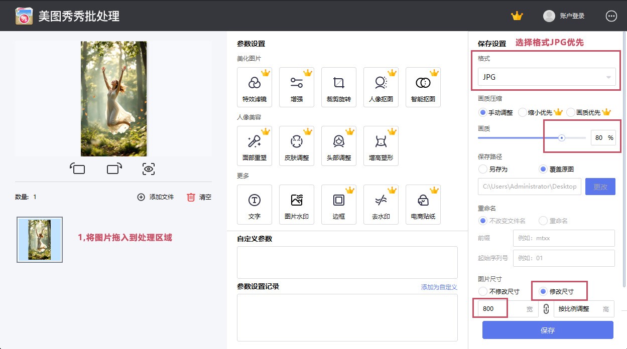 (1),参考下图,将图片拖入到处理区域,选择格式jpg,以及画质质量 设置为80%