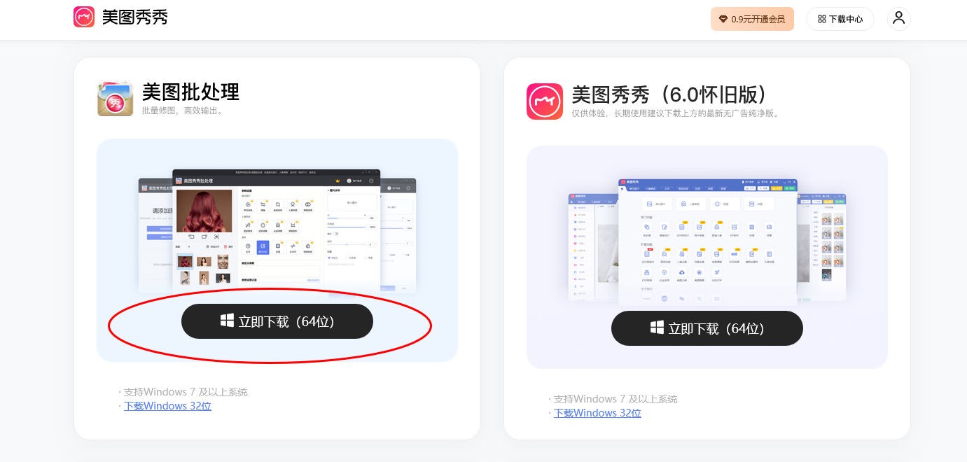 登录美图秀秀官方下载页面,下载软件并完成安装,链接地址: https://pc.meitu.com/download