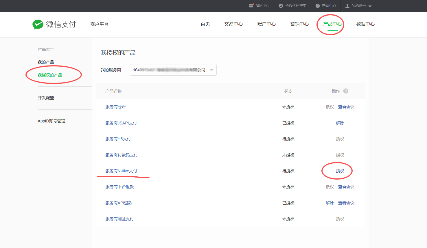 - 参考图片路径“产品中心” ->“我授权的产品” ,找到 “服务商Native支付”, 点击授权。