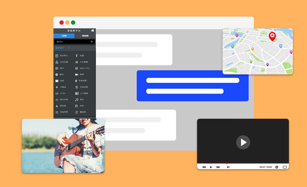 您可以使用可视化编辑器创建一个新的页面或者对原有页面进行编辑修改,编辑器具有更直观的用户界面,和拖放功能,用户可以通过丰富的设计组件轻松的编辑页面内容无需编写代码,比如:图片,视频,地图,轮播图等您可以想象到的设计的元素我们都已经集成到了系统中。您可以使用我们提供的设计组件以及素材库中的设计模块快速完成页面排版。