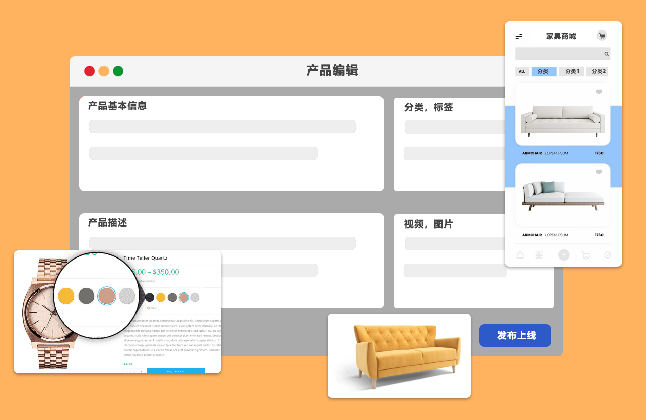 简单易用的产品上传功能,让您能轻松发布您的产品信息,轻松管理种类繁多的产品。在产品编辑页面中您可以设置产品,价格,图片,视频,分类,标签,库存数量,分享信息,运费设置,产品详情信息。支持发布实物或虚拟产品。支持多规格属性产品发布,如颜色,尺寸,型号,套餐,产品可针对不同规格套餐设置不同的价格。