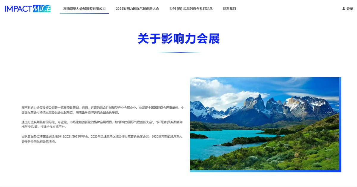海南影响力会展投资公司是一家集项目策划、组织、运营的综合性创新型产业会展企业。公司是中国国际商会理事单位、中国国际商会可持续发展委员会发起单位、海南循环经济研究会副会长单位。通过打造系列具有国际化、专业化、市场化和创新化的品牌会展项目,如“影响力国际气候创新大会”、“乡间[青]风系列青年社群沙龙”等,搭建合作交流平台。团队曾服务过博鳌亚洲论坛2019/2021/2023年年会、2020年泛珠三角区域合作行政首长联席会议、2020世界新能源汽车大会等多场高级别会展活动。