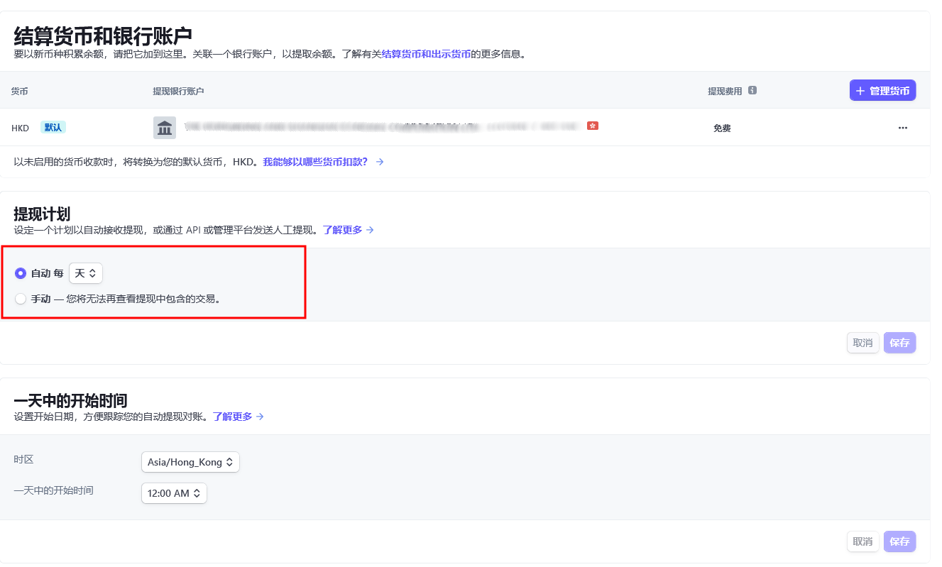 2,此次可以对,提现计划进行设置,可以设置提现的频率 ,或设置成为手动提现,通过下图的 提现费用可以看到 当前银行卡对strpe的提现是免费的