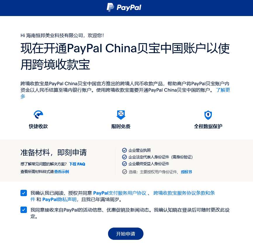 跨境收款宝是PayPal China贝宝中国为中国商户量身定制的一款跨境人民币收款产品。它可以帮助商户简单、快捷、安全、合规、稳健地将PayPal贝宝账户内资金结算至境内银行账户。在PayPal贝宝体系内可轻松申请开通。快捷收款,最快4小时人民币入账。