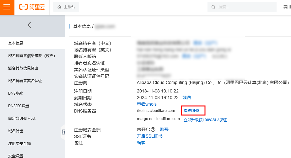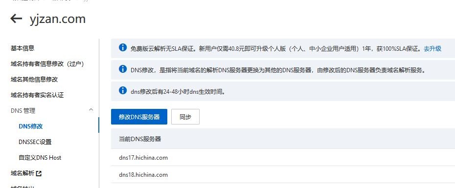 登录阿里云 aliyun.com, 然后进入域名 管理,参考下图。点击自定义DNS 并将DNS的修改为