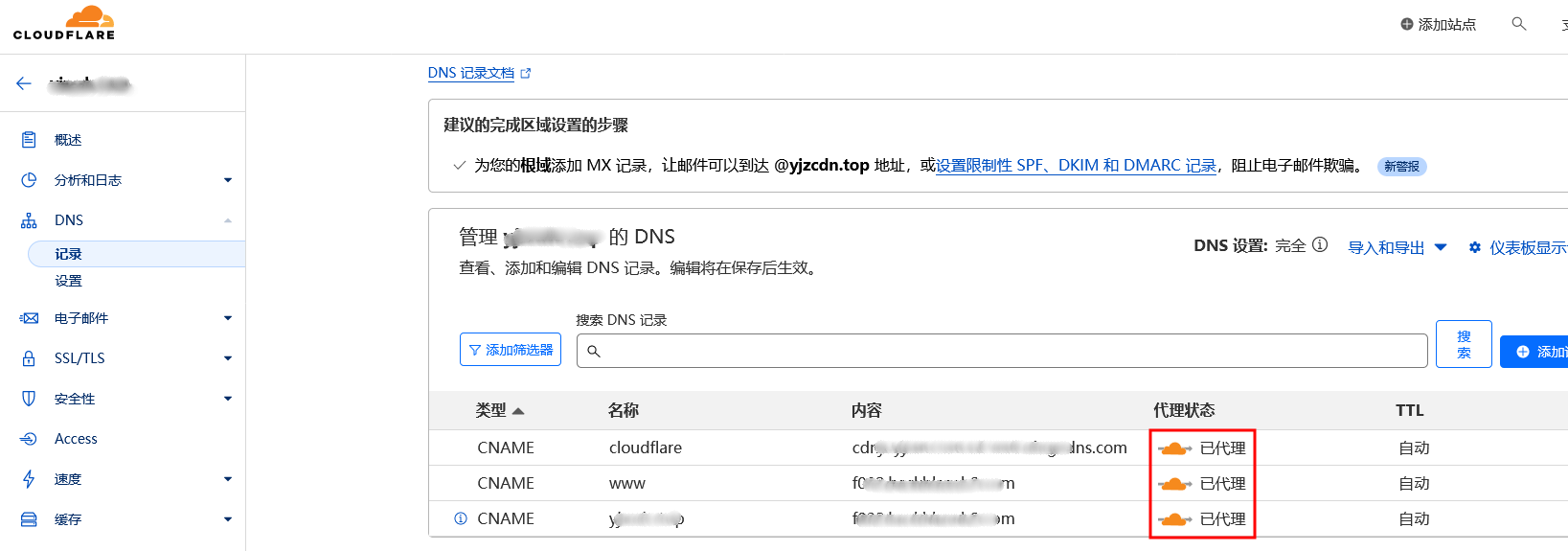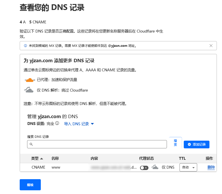 4,查看dns记录, cloudflare会将你域名下现有的解析记录全都备注下来,默认配置点击下一步