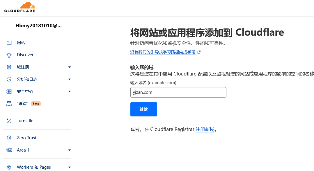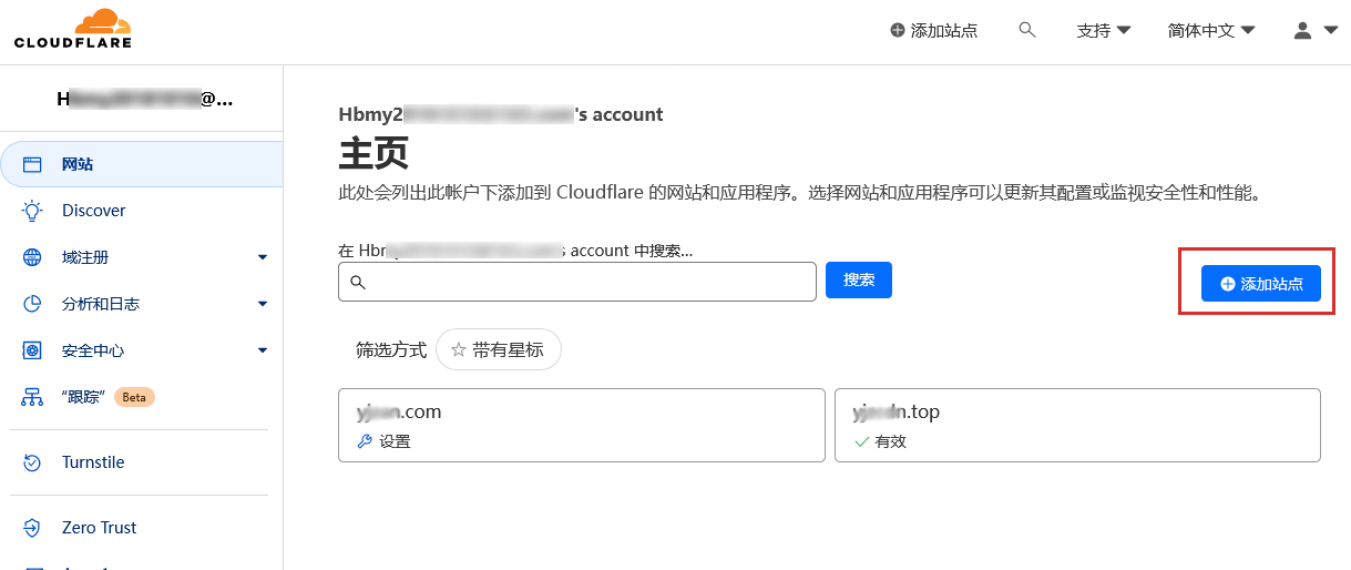 2,进入cloudfare控制台,点击”添加站点” ,并输入您需要加速的境外的站点域名。