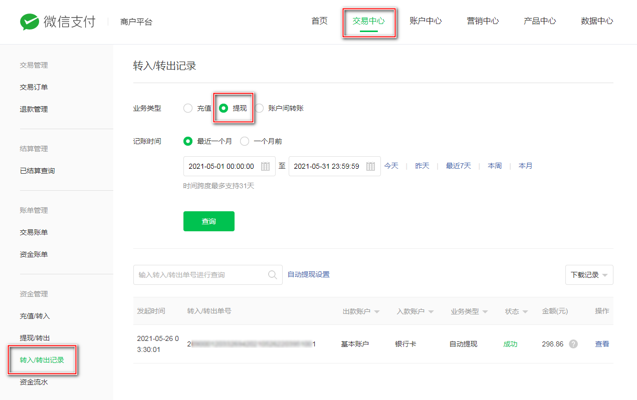 路径:微信支付商户平台(pay.weixin.qq.com)->交易中心->资金管理->转入/转出记录->业务类型选择[提现]。如下图所示: