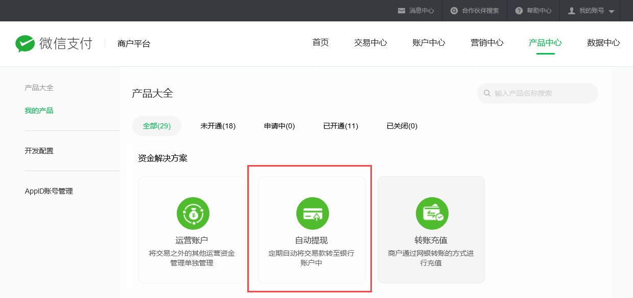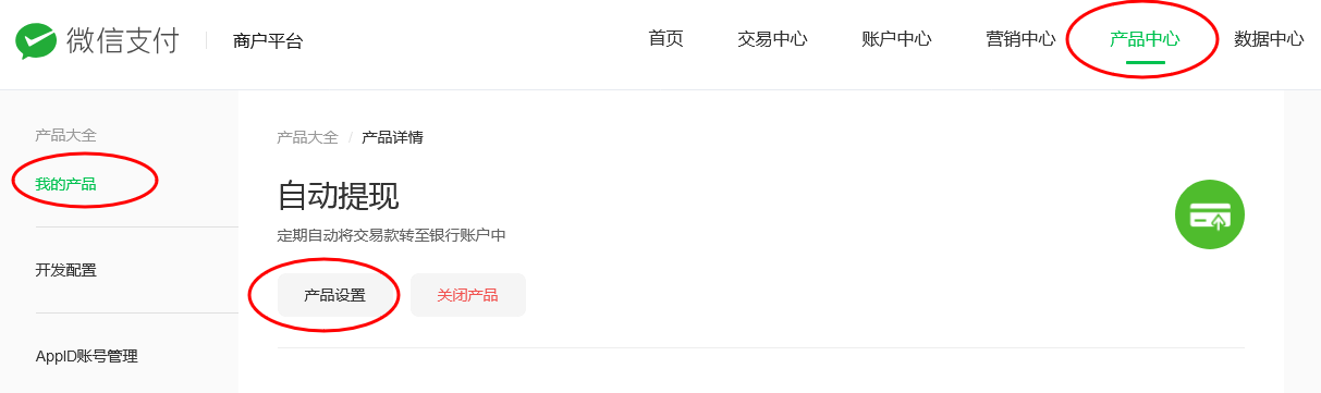 (1)电脑端:请超级管理员微信扫码登录微信支付商户平台(pay.weixin.qq.com)->【产品中心】->【我的产品】->【自动提现】操作;