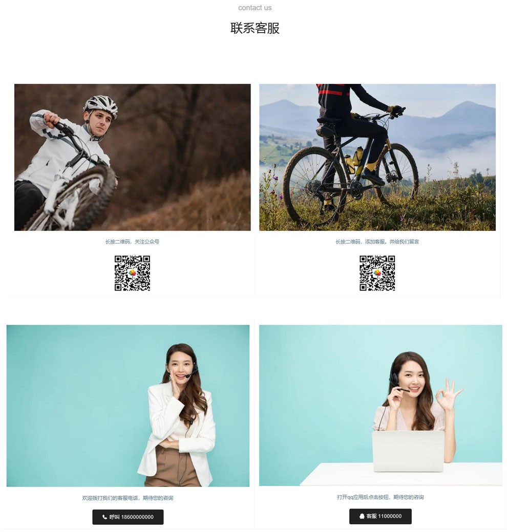 站点支持添加在线客服,如,微信二维码,联系电话,QQ客服,点击后即可发起对话,也支持第三方客服接入:如百度商桥等。