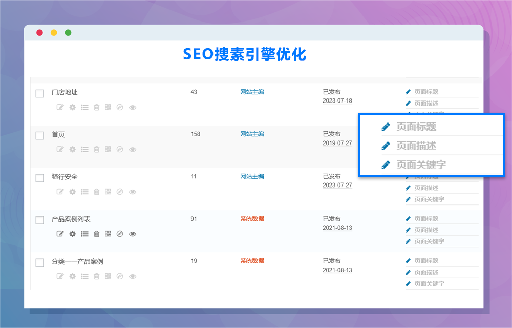 SEO对于网站来说非常重要,它可以提高网站的排名、流量、转化率和用户体验,同时降低营销成本,让互联网用户更容易找到他们需要的内容。如果您想让您的网站在搜索引擎中获得更好的排名和更多的流量,那么 SEO 是一个必须考虑的因素。易极赞建站系统的页面和文章均支持 搜索引擎TDK的设置,即标题,描述,关键字。调优的页面在搜索引擎被搜索引擎收录后,可以根据搜索的关键词或句子向用户展示,提升曝光率,从而增加站点流量,获取更多的访问用户。