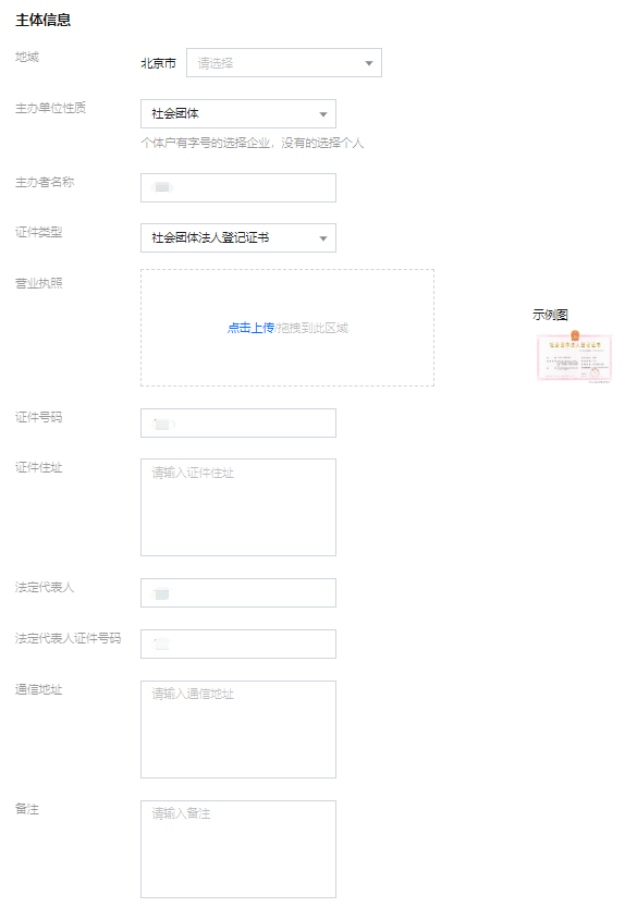 根据页面指引,填写如下信息,并上传相关证件。,各个省份要求的备案材料存在差异,请根据表单内容填写并提交相关材料,如下图所示: