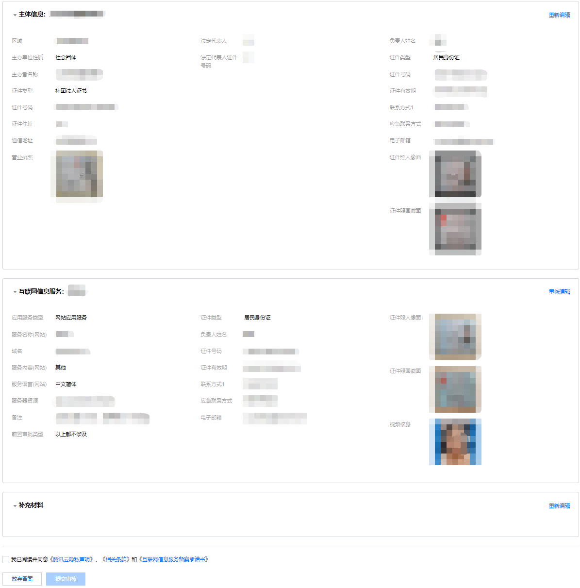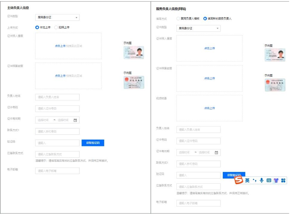 - 企业的营业执照,法人身份证,网站负责人需要扫脸,并提供手机核验短信,