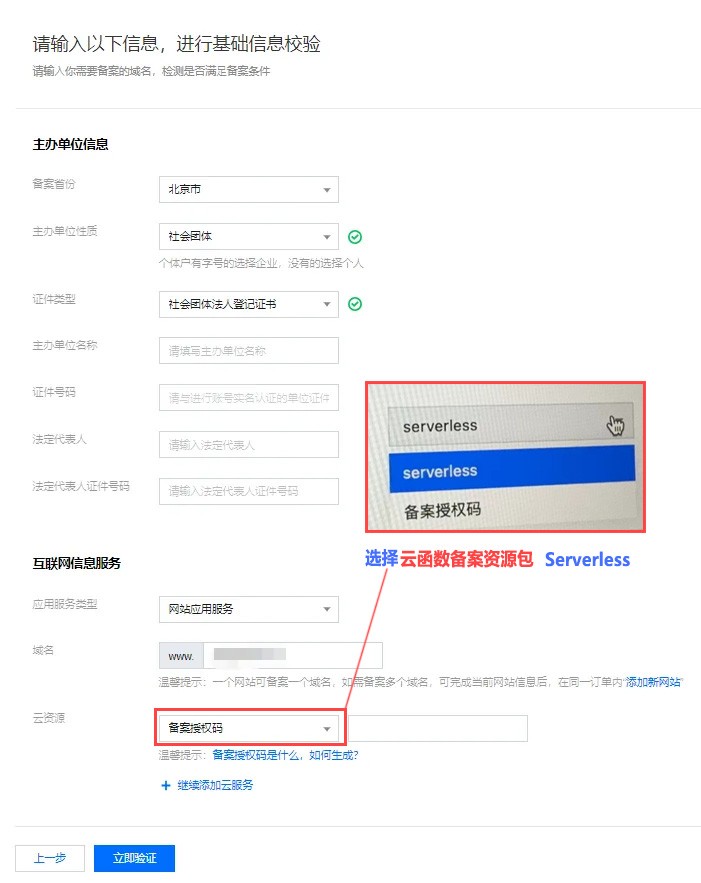 开始填写备案基础信息,在下方的云资源处 选择我们已购买的 云函数备案资源包