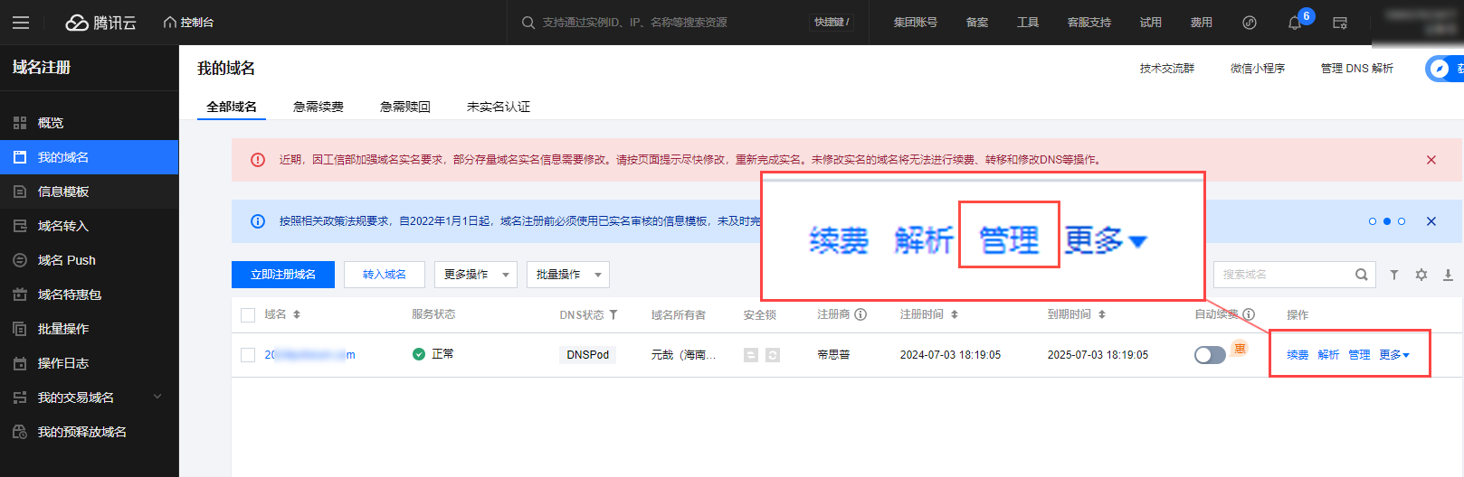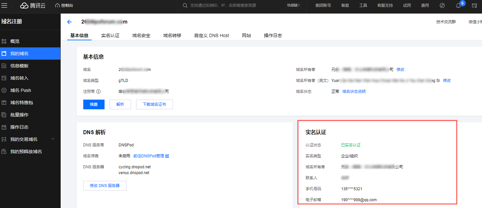 - 域名不是在腾讯云注册购买的,需要域名实名证明的请参考第二部分8节处理。腾讯云购买的域名请忽略这条!