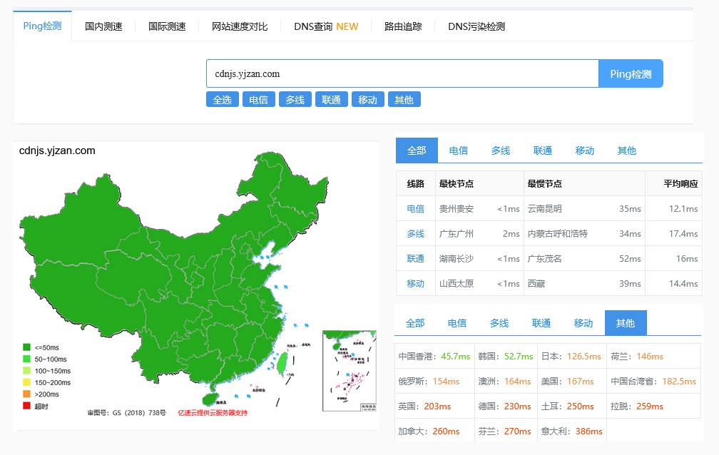 通过访问站长工具 ping.chinaz.com ,输入相关域名地址,可以查询到响应的服务器地址以及网络延时时间。